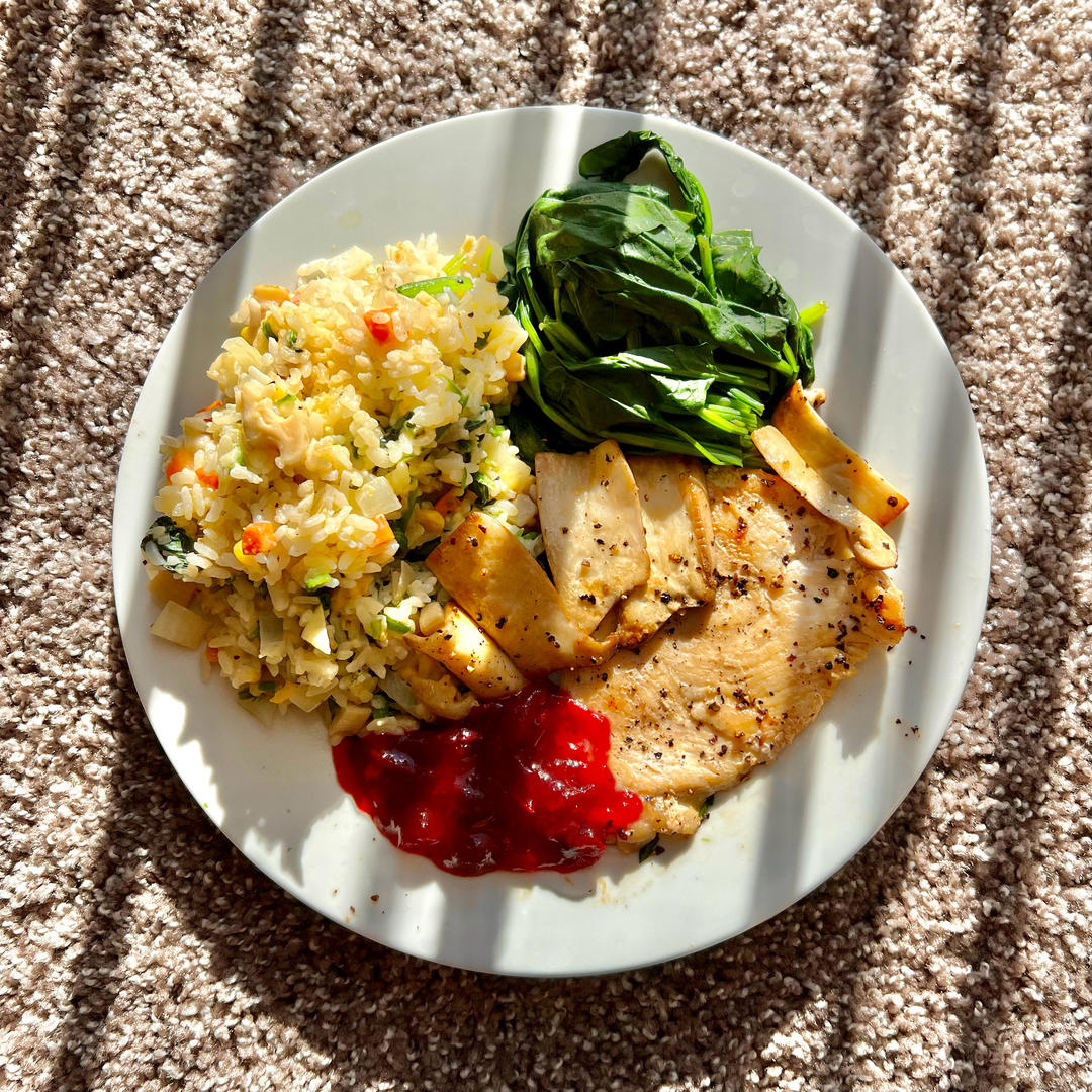 煎鸡胸肉配蔓越莓酱&煎杏鲍菇&奶香芝士烩饭