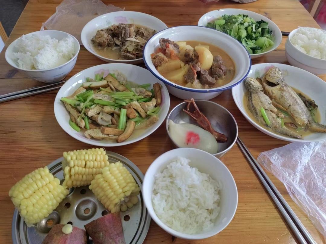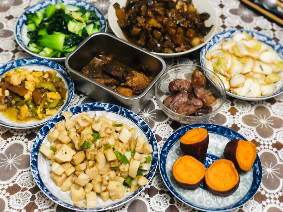 肉丁茄子、糖醋藕、醋溜白菜、上海青、带鱼、腊味香肠、蒸红薯。