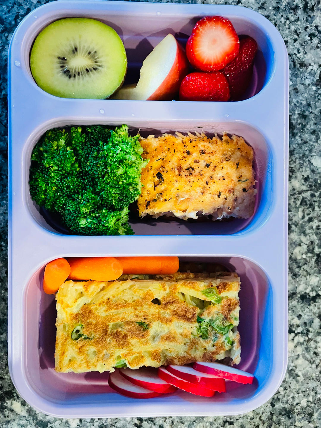 土豆饼、香煎三文鱼、西兰花、胡萝卜、水萝卜、苹果、猕猴桃、草莓