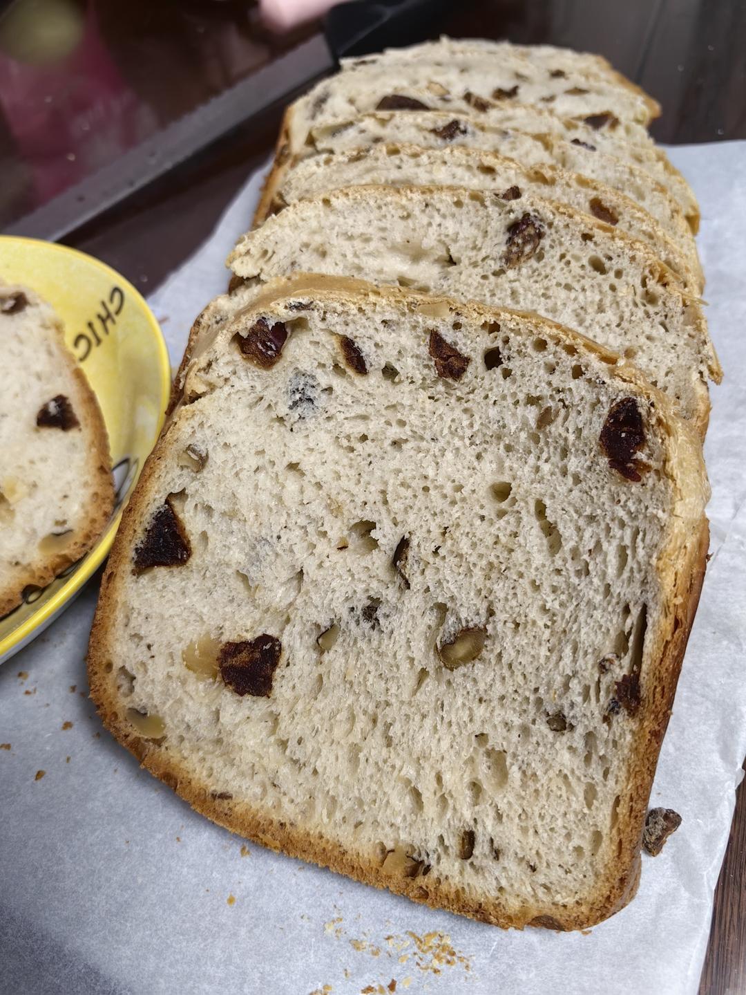 水放多了 168g,面粉多放了8g,依然还是加了奶粉,果料是核桃和大枣,糖40g很甜...