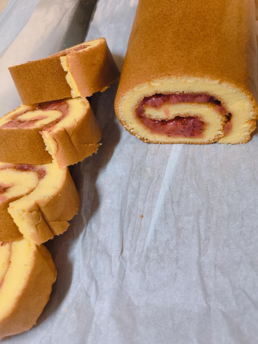 自制的草莓酱做的浮云卷,发现比奶油好卷多了。。上下火170°20分钟,后十分钟开热风。