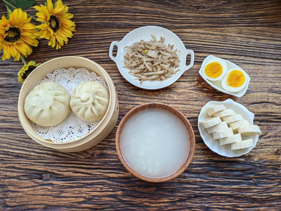 大米粥🥣+羊肉包子🥟+炒莲菜丝🥗+鸡蛋🥚+香蕉🍌