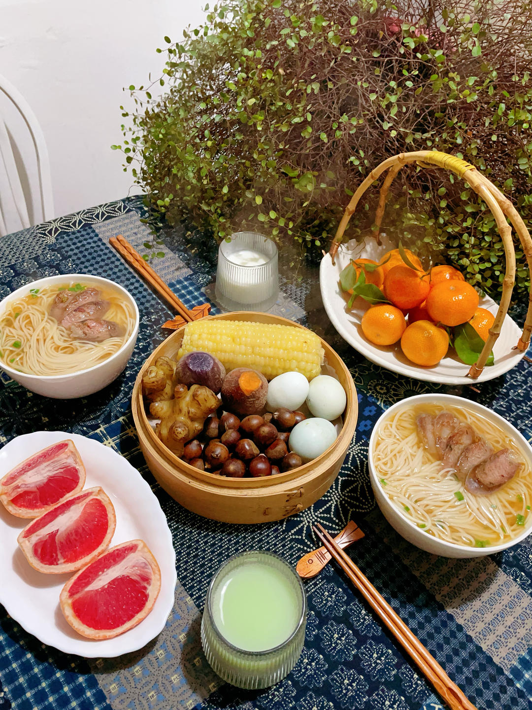 周五早餐 煮面条配上自己做的辣肠很美味。蒸玉米、洋姜和红薯,煮锥栗和青壳鸡蛋,砂糖桔和西柚。 #早餐•2024年1月5日...
