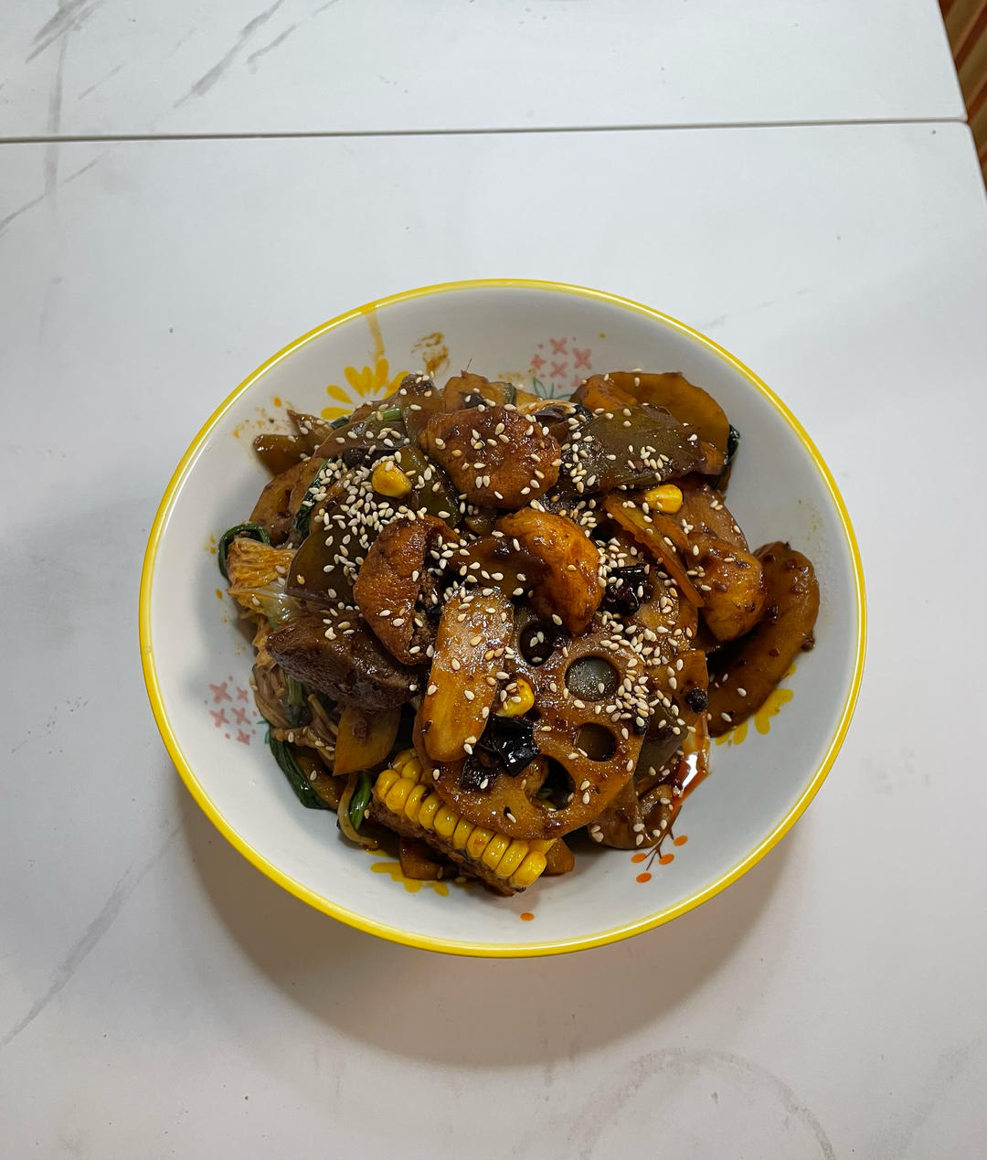 麻辣香锅家庭快手版,加了火锅底料老干妈和黄豆酱,好吃😋