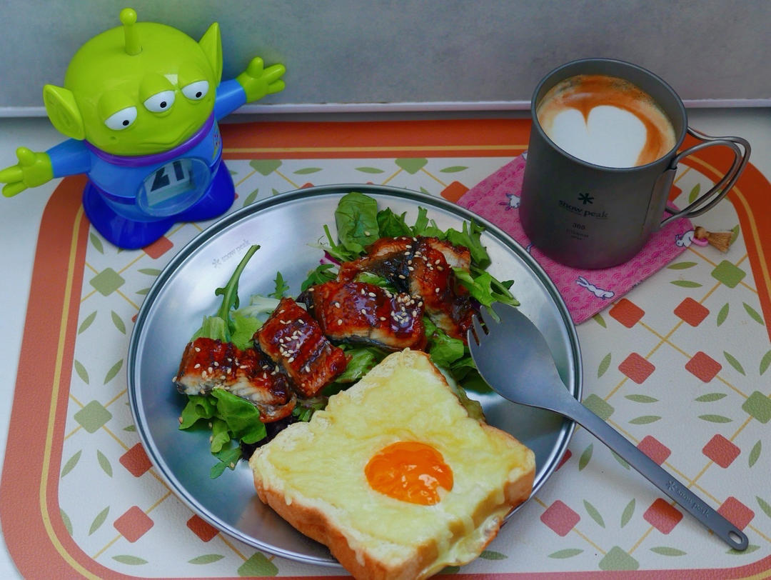 周末早午餐:烤鳗鱼&油醋汁淋菜叶子&太阳蛋吐司&拿铁☕️