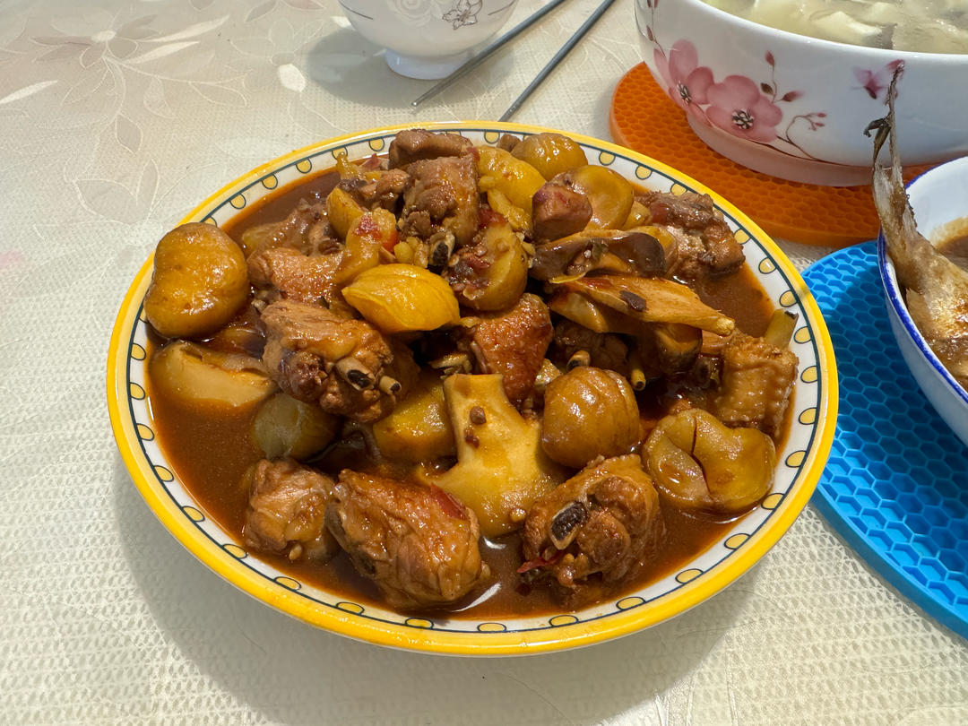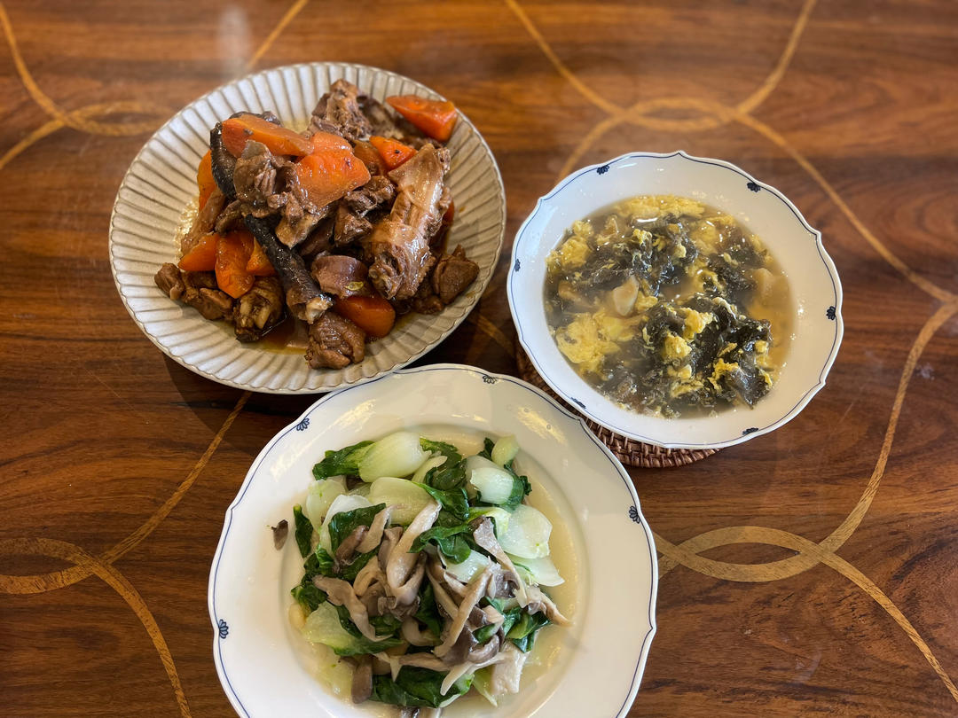 红烧鸡 平菇炒矮脚黄 紫菜蛋汤