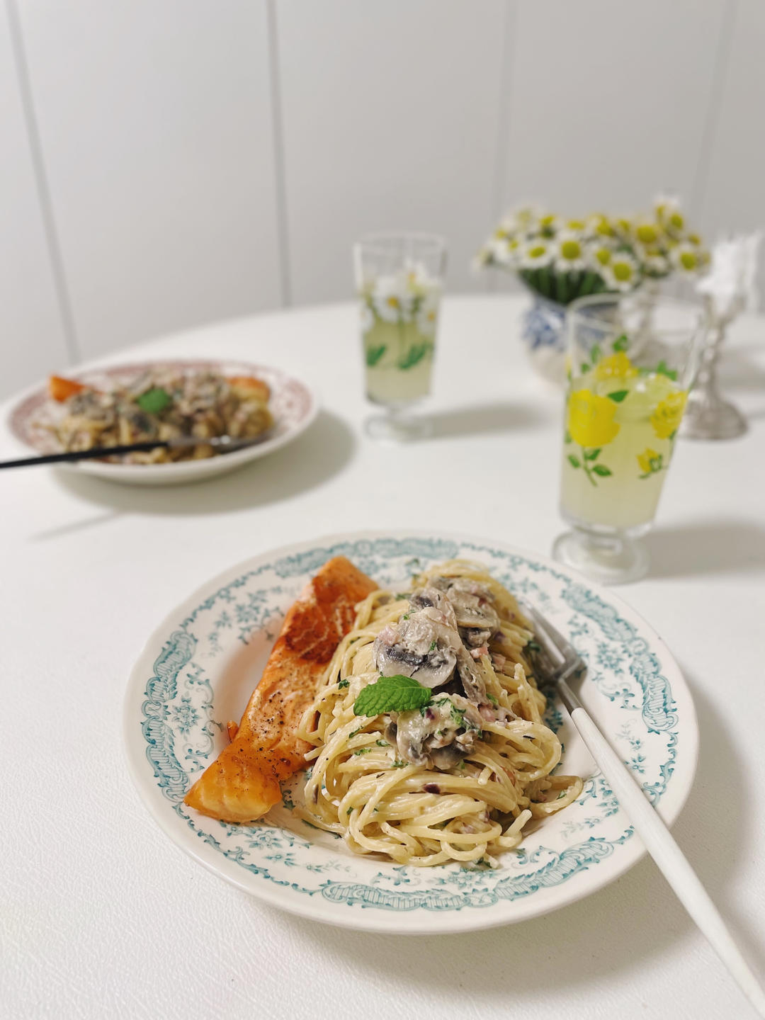 午餐和小朋友吃的奶油培根蘑菇意面