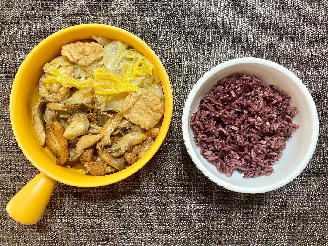 五花肉炒平菇、娃娃菜炖豆泡、杂粮饭(稻花香、紫糯米、燕麦)