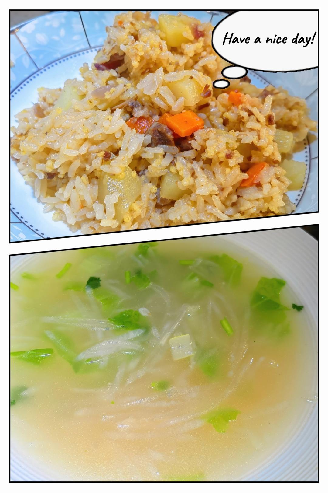 牛腩土豆胡萝卜二米饭,虾皮萝卜丝汤。