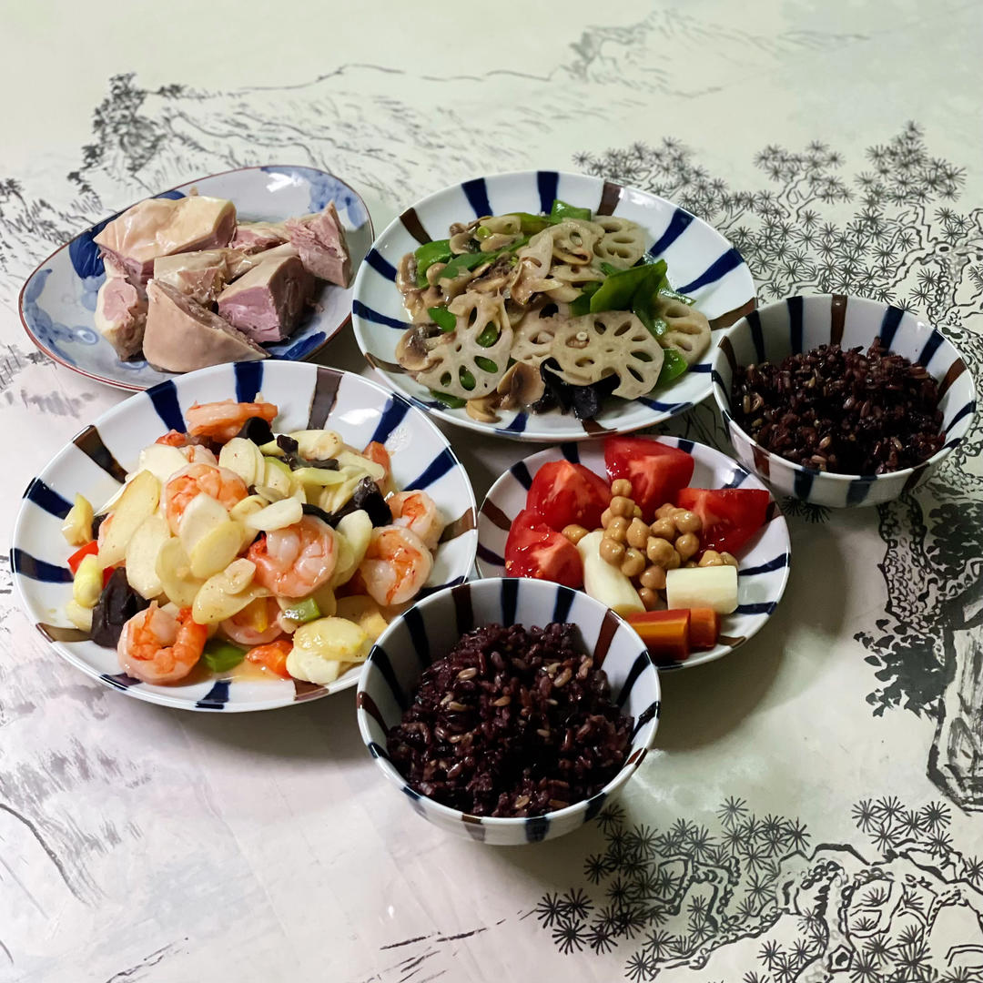 午晚餐|茭白彩椒黑虎虾仁+桂花盐水鸭+莲藕荷兰豆+糙米米饭+粉番茄山药鹰嘴豆小拼~🌷