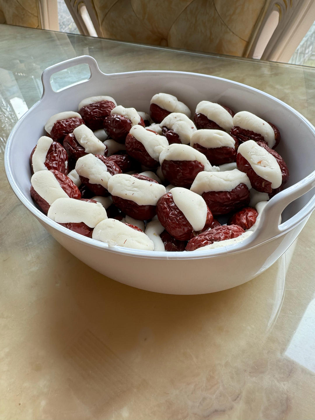 加了10克水磨粉替代糯米粉,水量多了,后来又加了一些糯米粉,自制桂花蜜加冷开水调制,很棒!