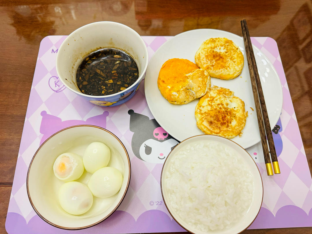 今日份早餐记录:全蛋宴配白粥。简简单单。