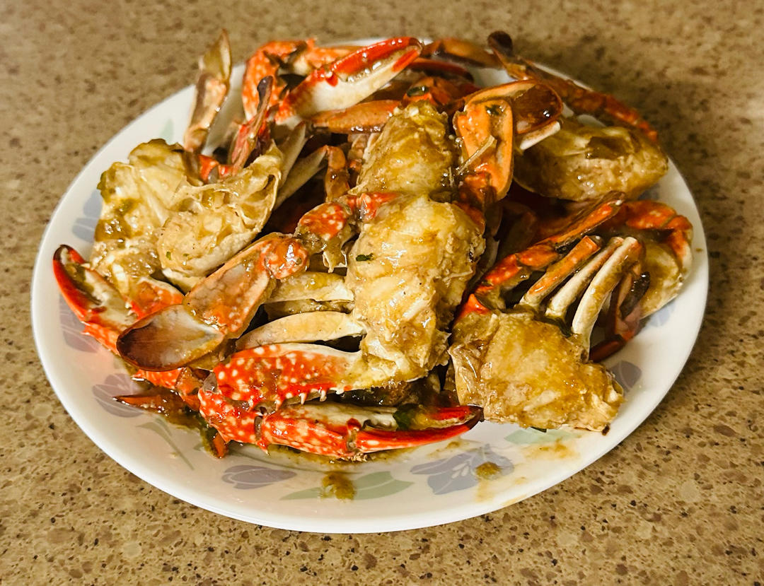 姜葱炒蟹🦀(韓国进口盒裝速冻螃蟹)味道不錯,😀👍
