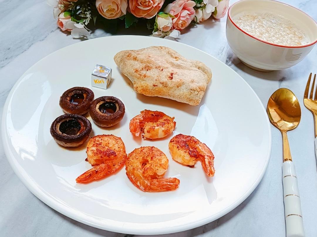 辰辰早餐~香煎口蘑,煎黑椒虾仁,嫩牛五方,奶酪,牛奶燕麦