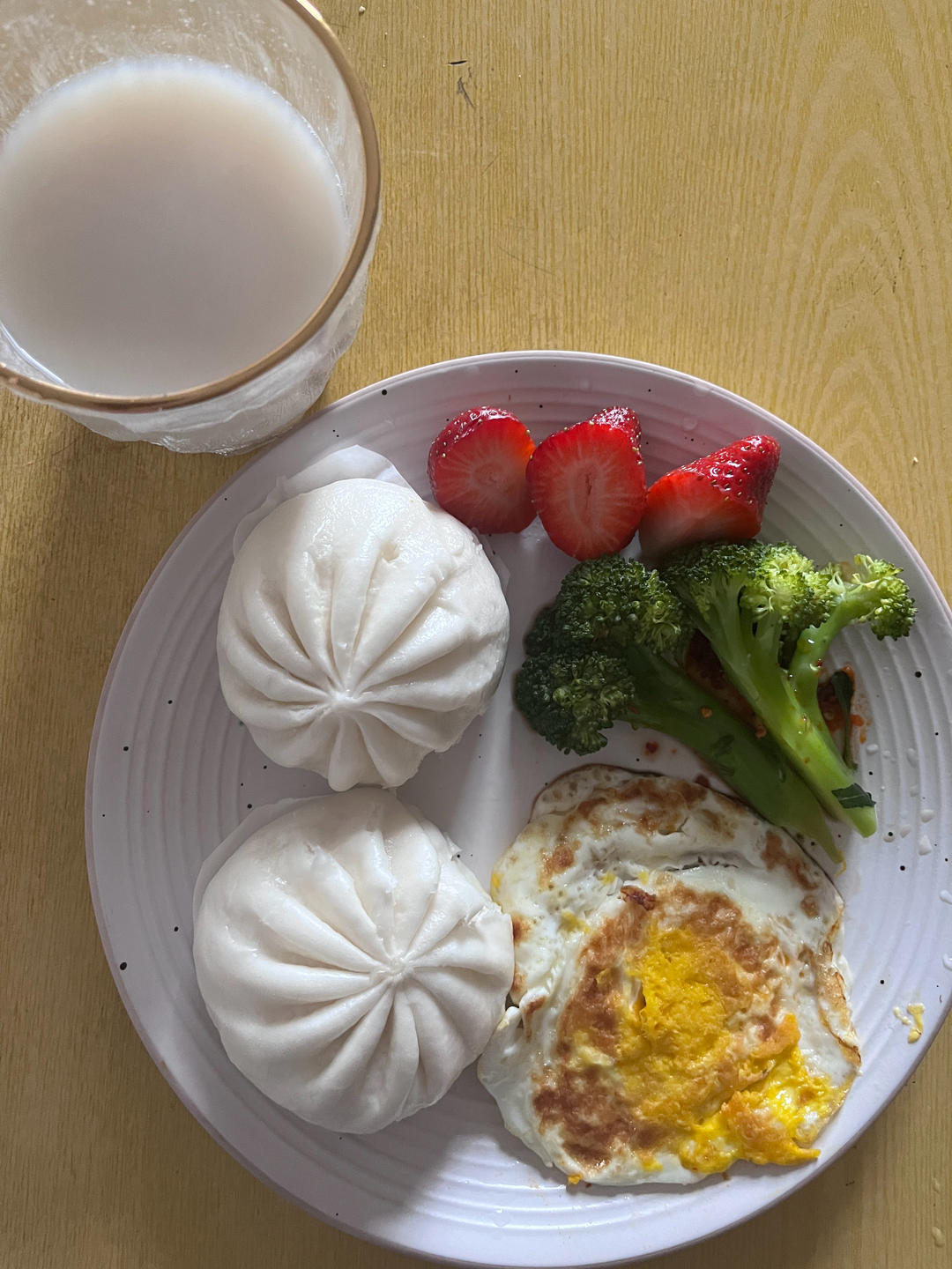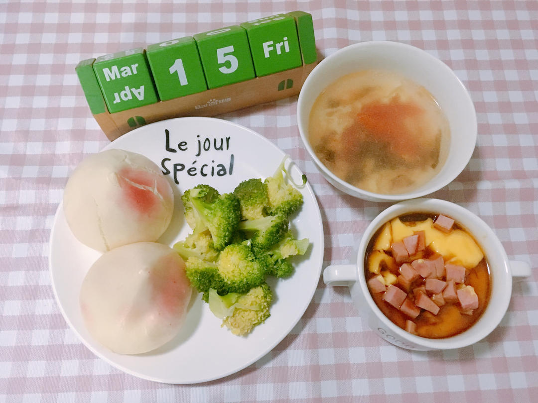 G7S2.W3Day5.寿桃包加火腿丁蛋羹搭麻油西蓝花🥦配西红柿🍅鸡蛋汤
