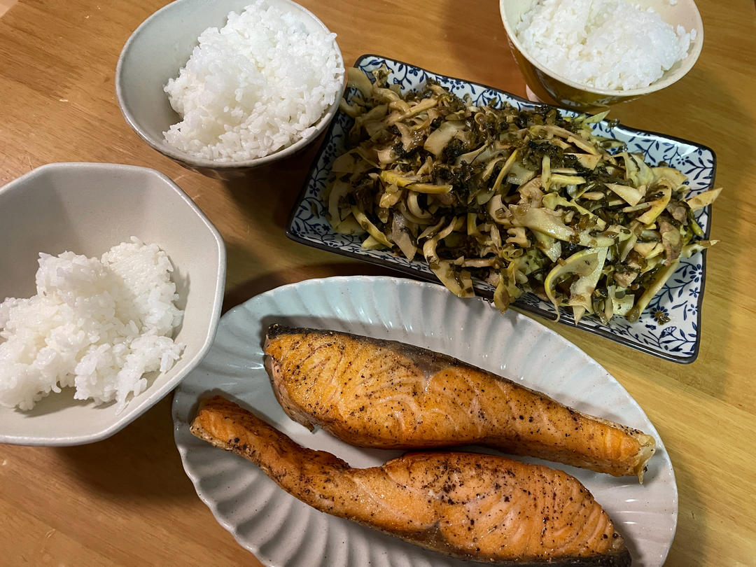 煎三文鱼,雷笋雪菜炒肉,米饭。