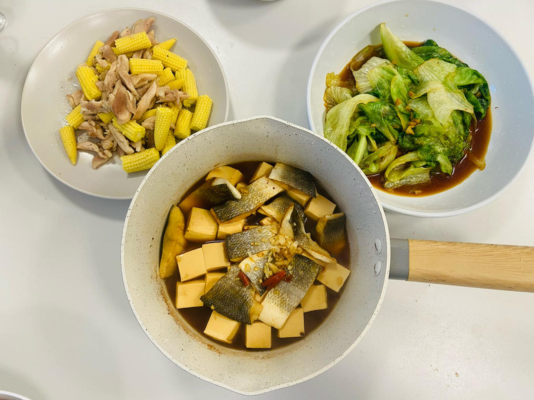 玉米笋炒鸡肉 鲈鱼豆腐煲 蚝油生菜