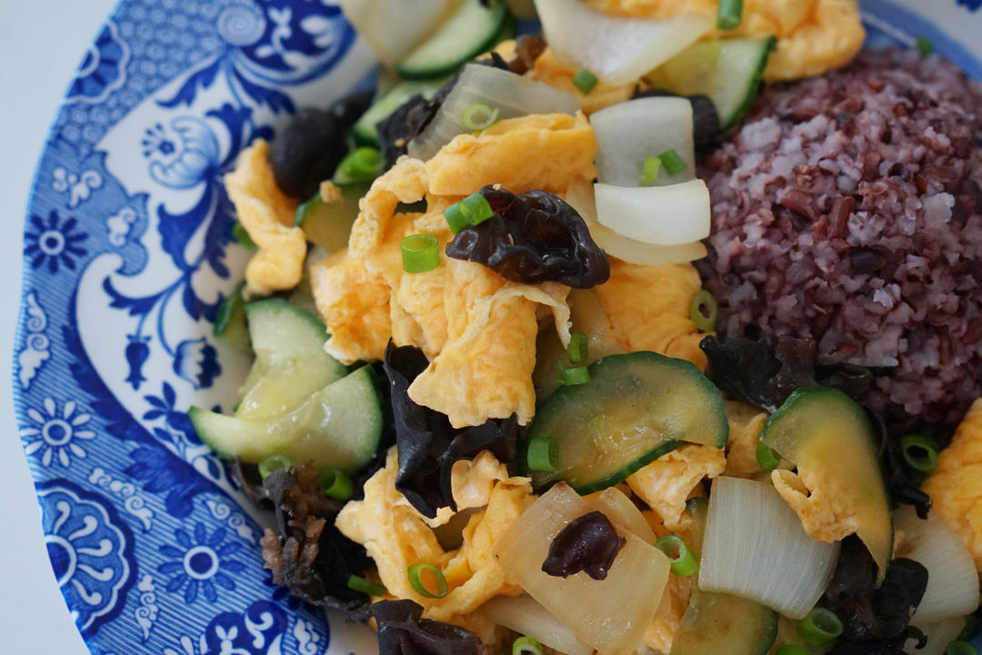 家孩子爱吃的洋葱木耳炒鸡蛋,还放了半根黄瓜,一人一份盖饭。#晚餐•2024...