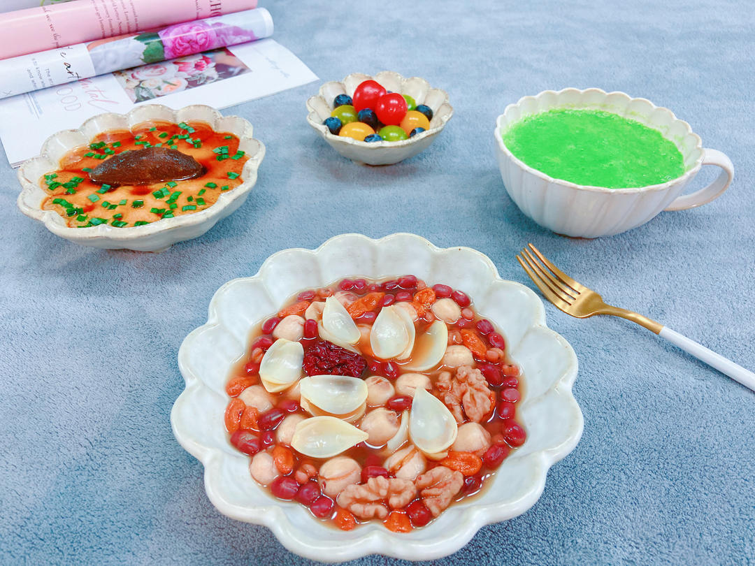 无糖版补益气血六宝甜汤🍲+海参炖蛋🫕+西兰花香蕉奶昔🥦🍌🥛+水果🫐🍒;图6⃣️凑图 某仁驱车30公...