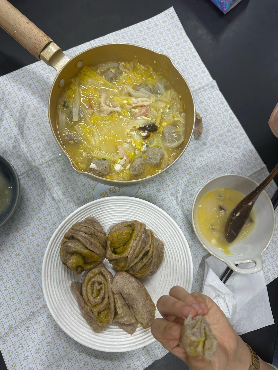 黑麦姜黄花卷+吃剩的鱿鱼丝鲮鱼娃娃菜