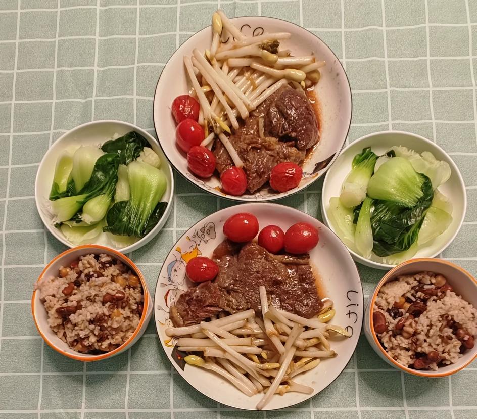 圣女果香煎牛扒、素炒花生芽、白灼上海青、杂粮饭