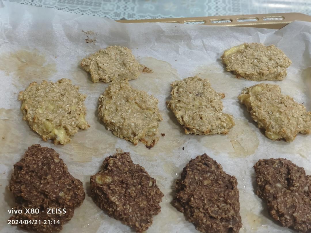 可可粉一半 三根熟透过头的香蕉 油纸上喷少量油 放了椰蓉 花生酱 180℃ 16分钟