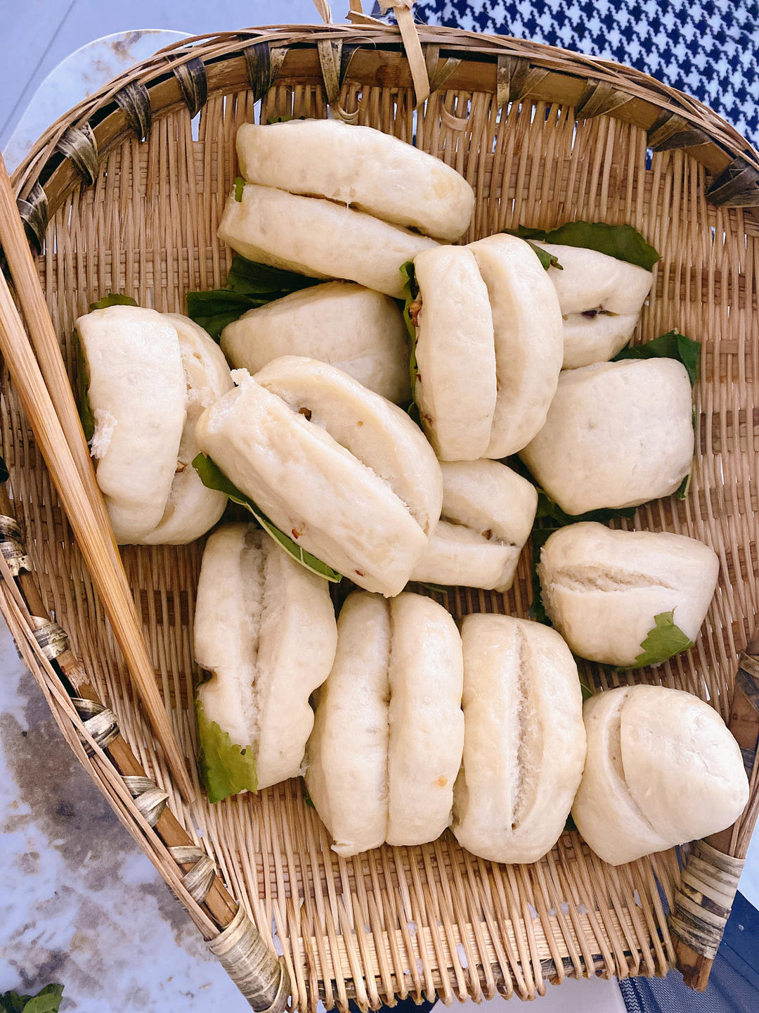 蒸出来好大一个个的 桑叶把馒头裹起来好香啊