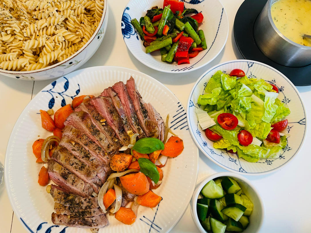 烤小牛肉🥩,炒芦笋红菜椒🫑,...