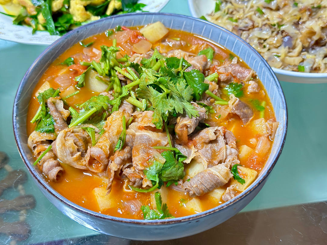 番茄土豆肥牛+凉拌海蜇🪼+韭菜炒鸡蛋+春卷