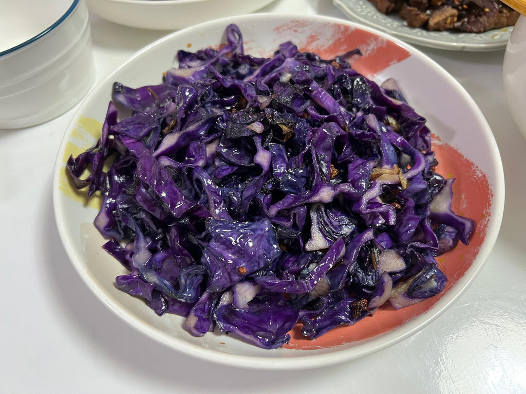 炝炒紫甘蓝,切丝后撒盐放冰箱冷藏杀水了几小时,不知是不是保持美好颜色的原因,