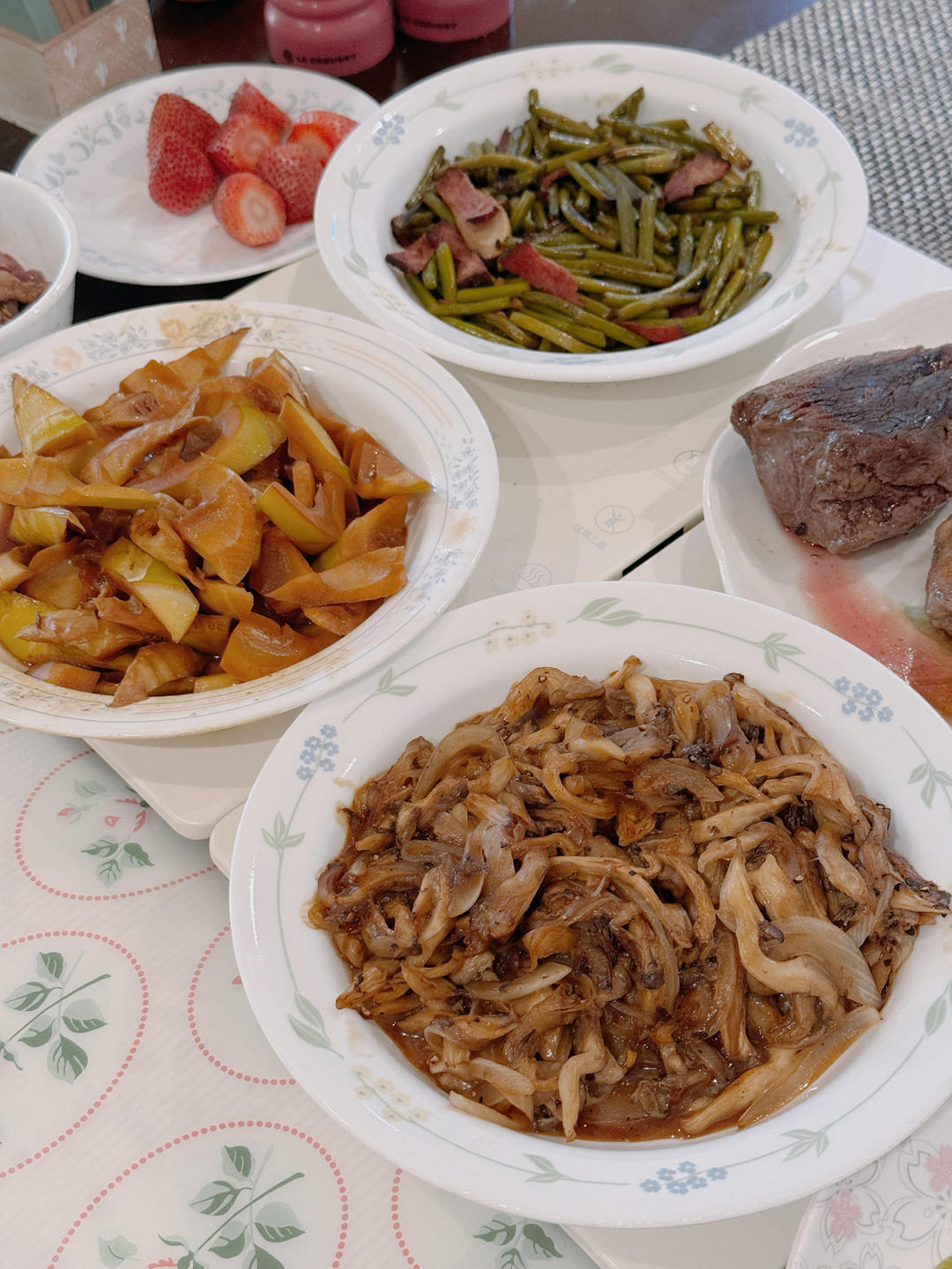 主人做的三个菜是p4照烧牛肉(Costco买的牛肉片好薄)、p5莴...