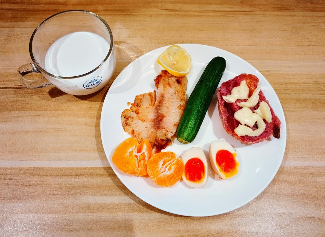 蒜香煎鱼排,水果黄瓜 🥒 溏心蛋,紫薯恰巴塔配芝士🍊🥛