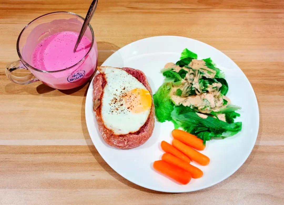 紫薯恰巴塔煎蛋🍳生菜沙拉,水果胡萝卜,紫薯酸奶!