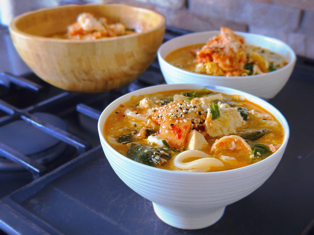 鸡肉鲜虾海藻虾米紫苏泡菜乌冬面🍜
