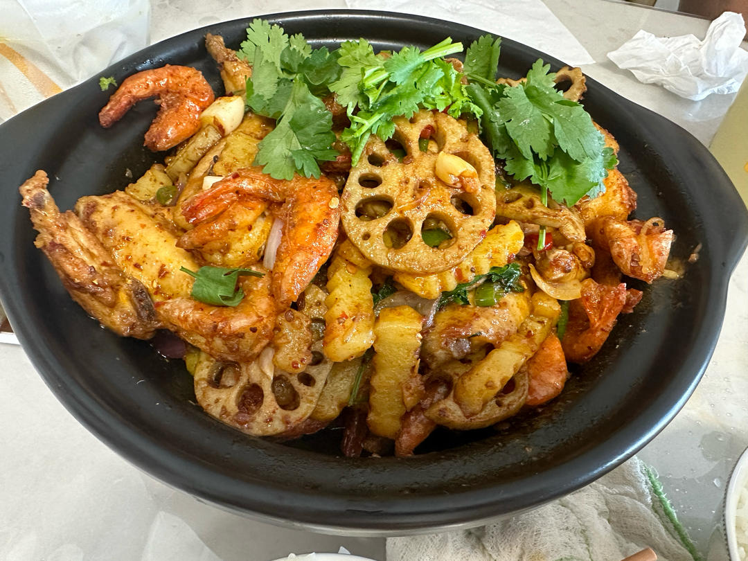 油爆河虾、蔬菜丁