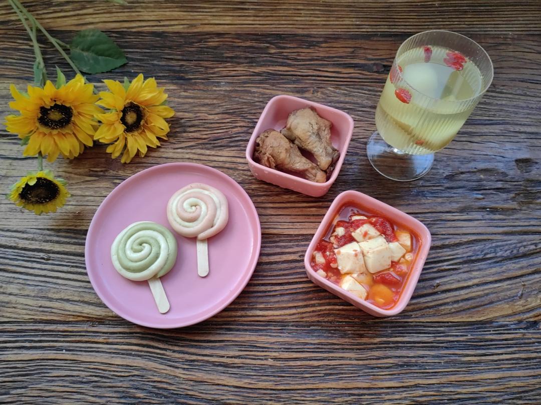 小吊梨汤🍐+棒棒糖馒头🍥+番茄豆腐🥗+鸡腿🍗