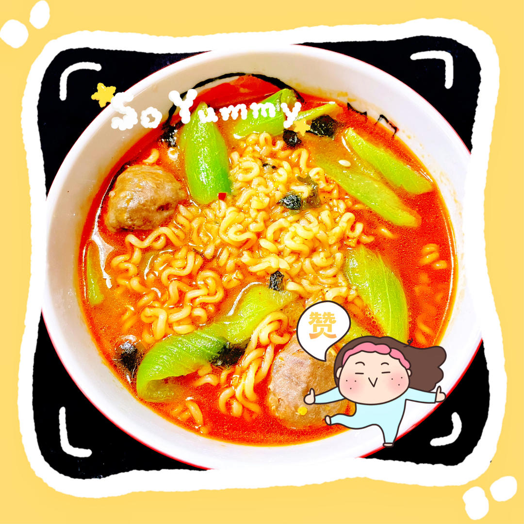 午餐一碗泡面,加了两个牛肉丸和丝瓜,美美哒一顿!😄😄😄