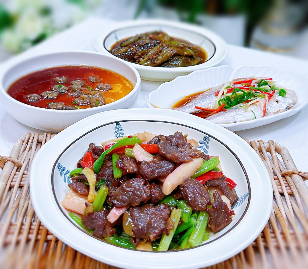 酸萝卜炒牛肉、海参蒸蛋、油泼金线鱼、油焖肉末青椒