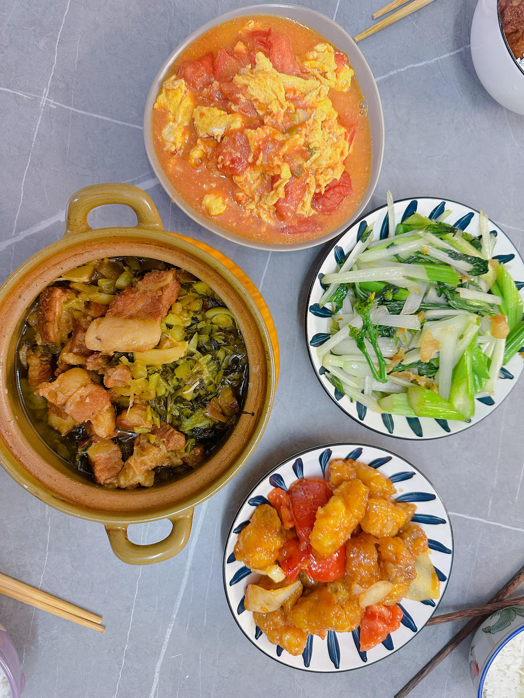 咸菜焖猪肉、甜酸排骨、番茄炒蛋、炒青菜