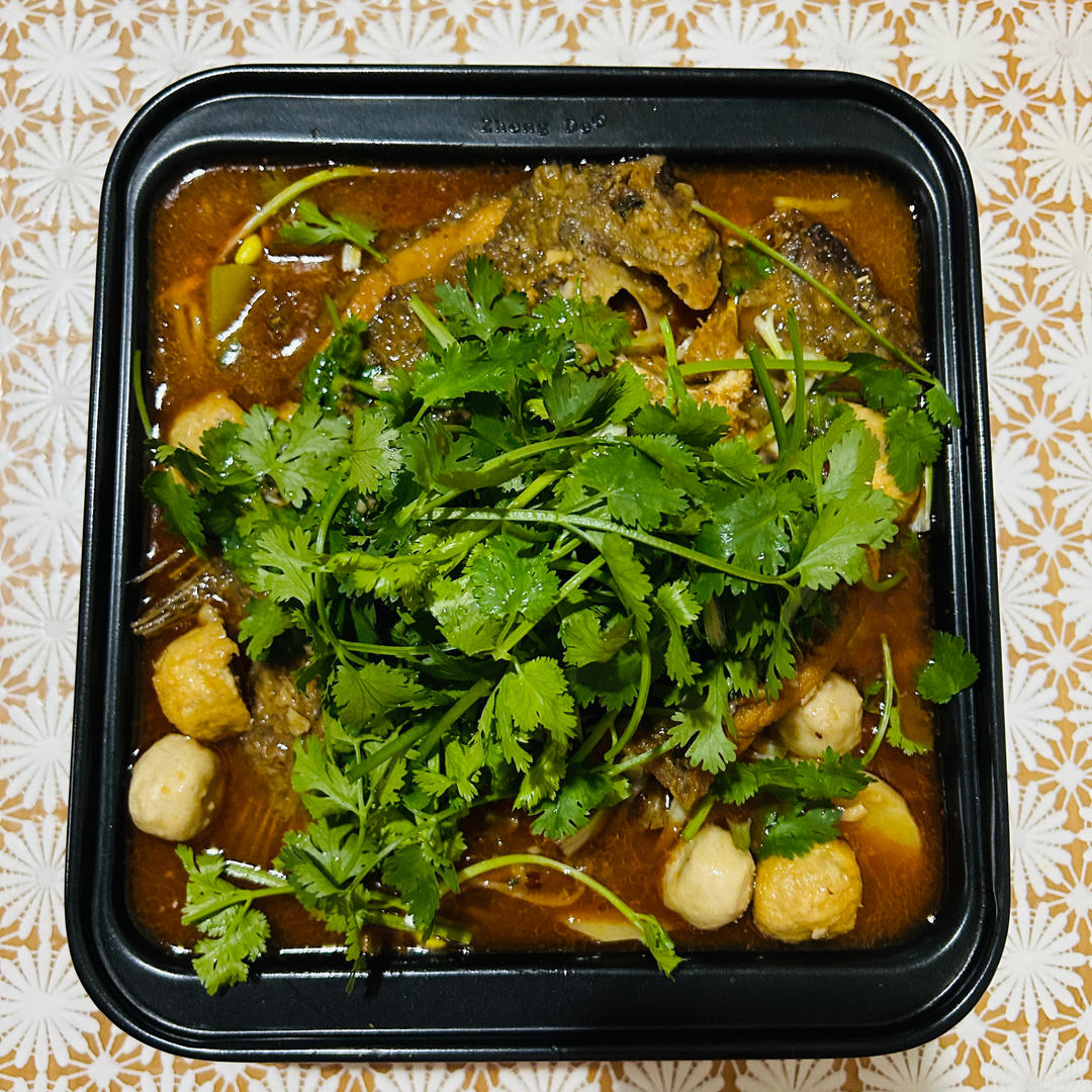 【烤非洲鲫鱼】底下铺了土豆片、莴苣片、黄豆芽、海带根、香菇贡丸、芋泥肉丸
