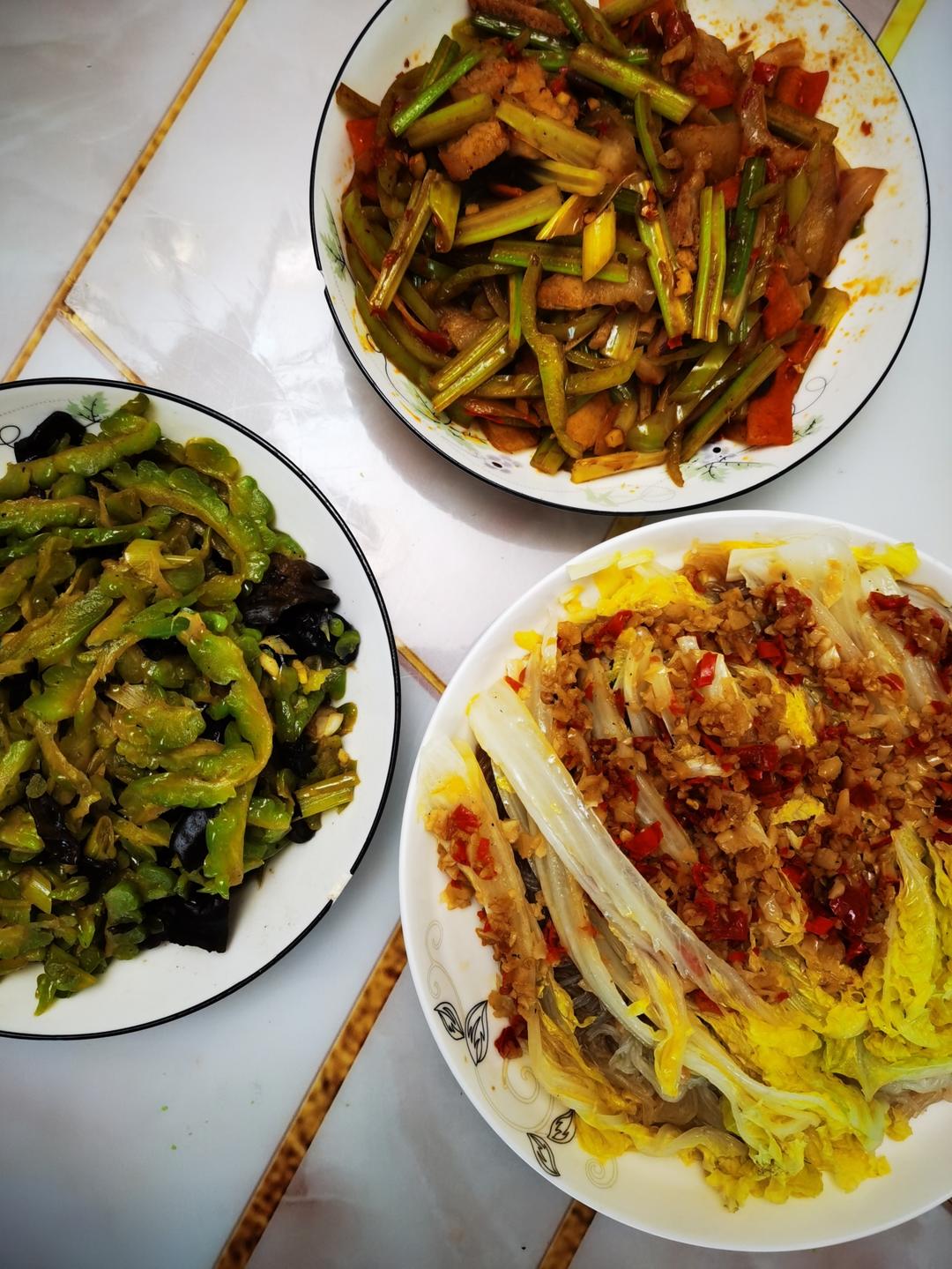 蒜蓉粉丝娃娃菜,回锅肉,苦瓜炒木耳,杂粮米饭😊