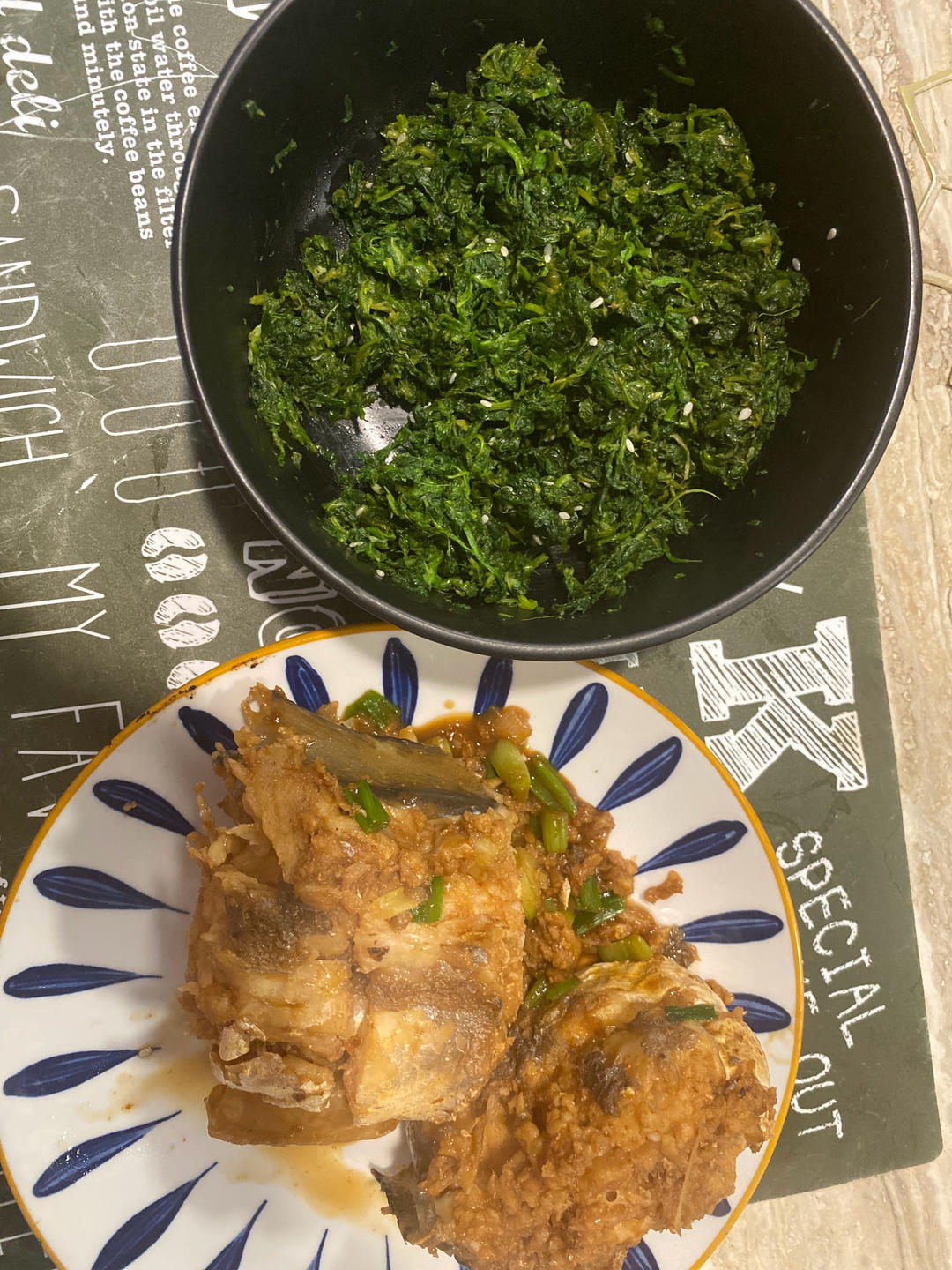 红烧鳗鱼和凉拌荠菜,又荤又素的一顿,丰盛!