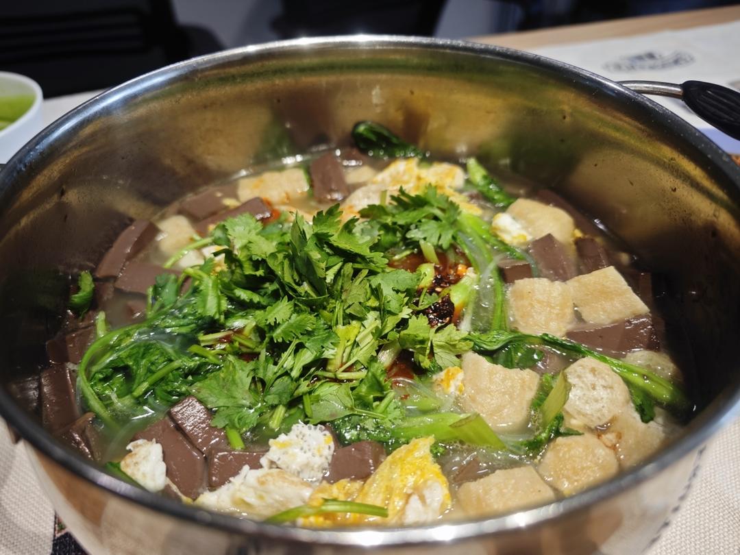 鸭血鸡毛菜油豆腐粉丝汤+鱼香肉丝+番茄花菜炒香肠