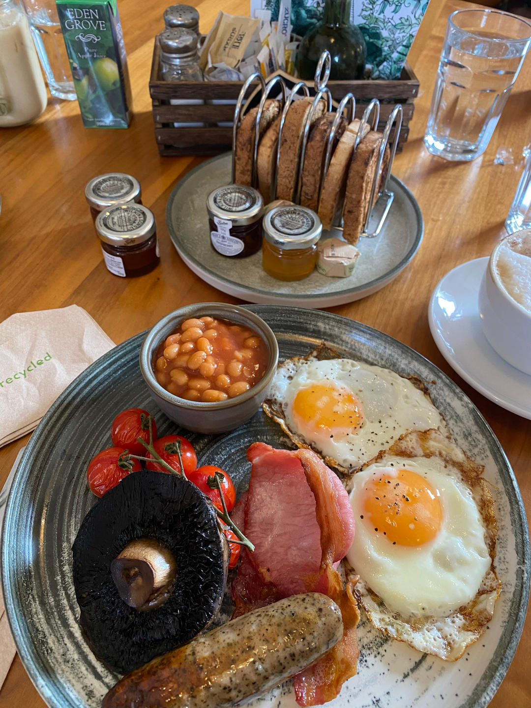 林肯郡香肠,英式咸腌肉,焗黄豆,樱桃西红柿,波托贝罗蘑菇,水波蛋,白或黑麦吐司和酱料(香肠确实比普通...