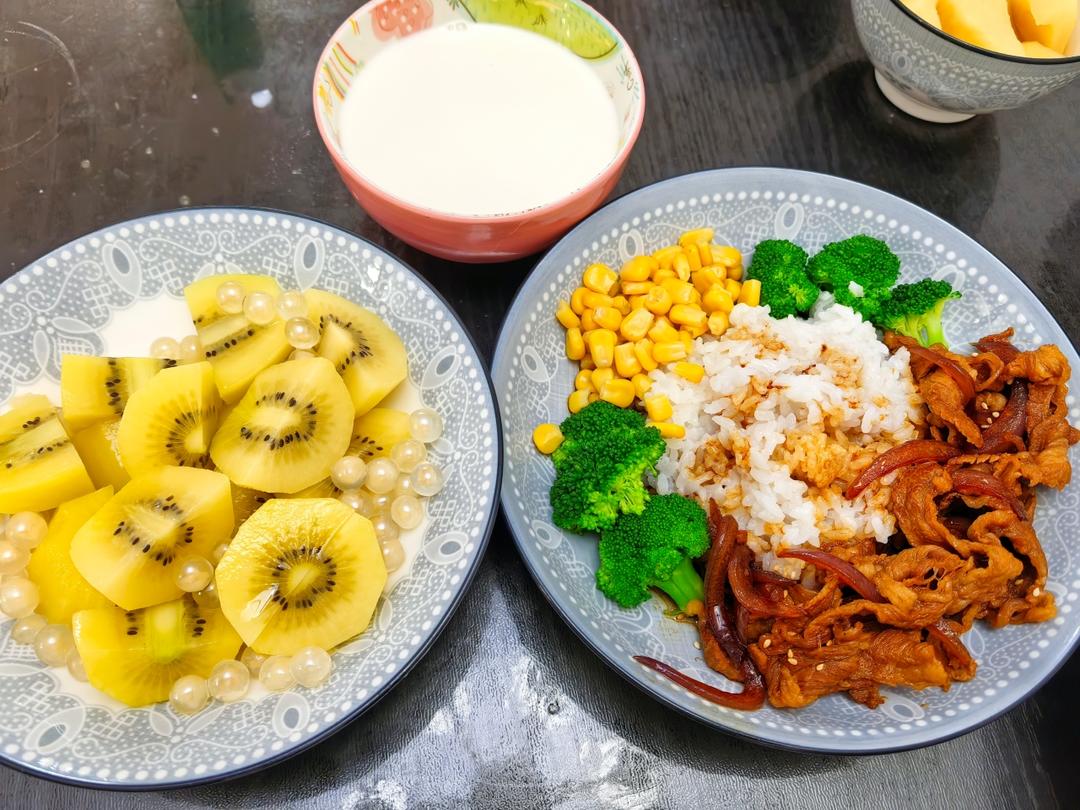 早餐。水果大王就是我,蜜瓜,藍莓、樹莓、草莓、香蕉、蘋果、獼猴桃、罐頭黃桃!