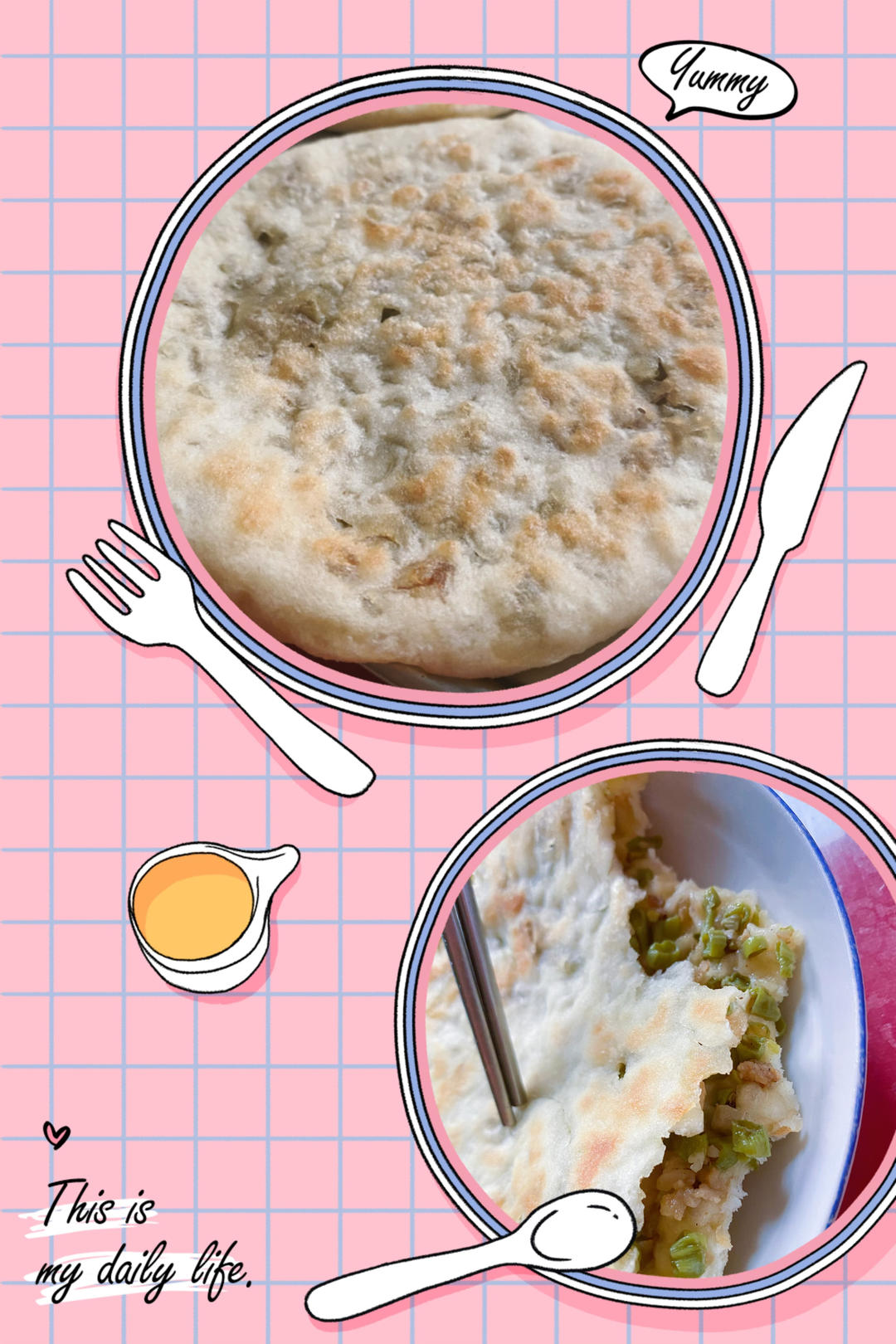 普通面粉加盐揉面团醒面,缸豆炒肉末➕点辣椒调味,简简单单方便,包成圆饼擀平,电饼档里不需要放油,几分钟就OK了,很...