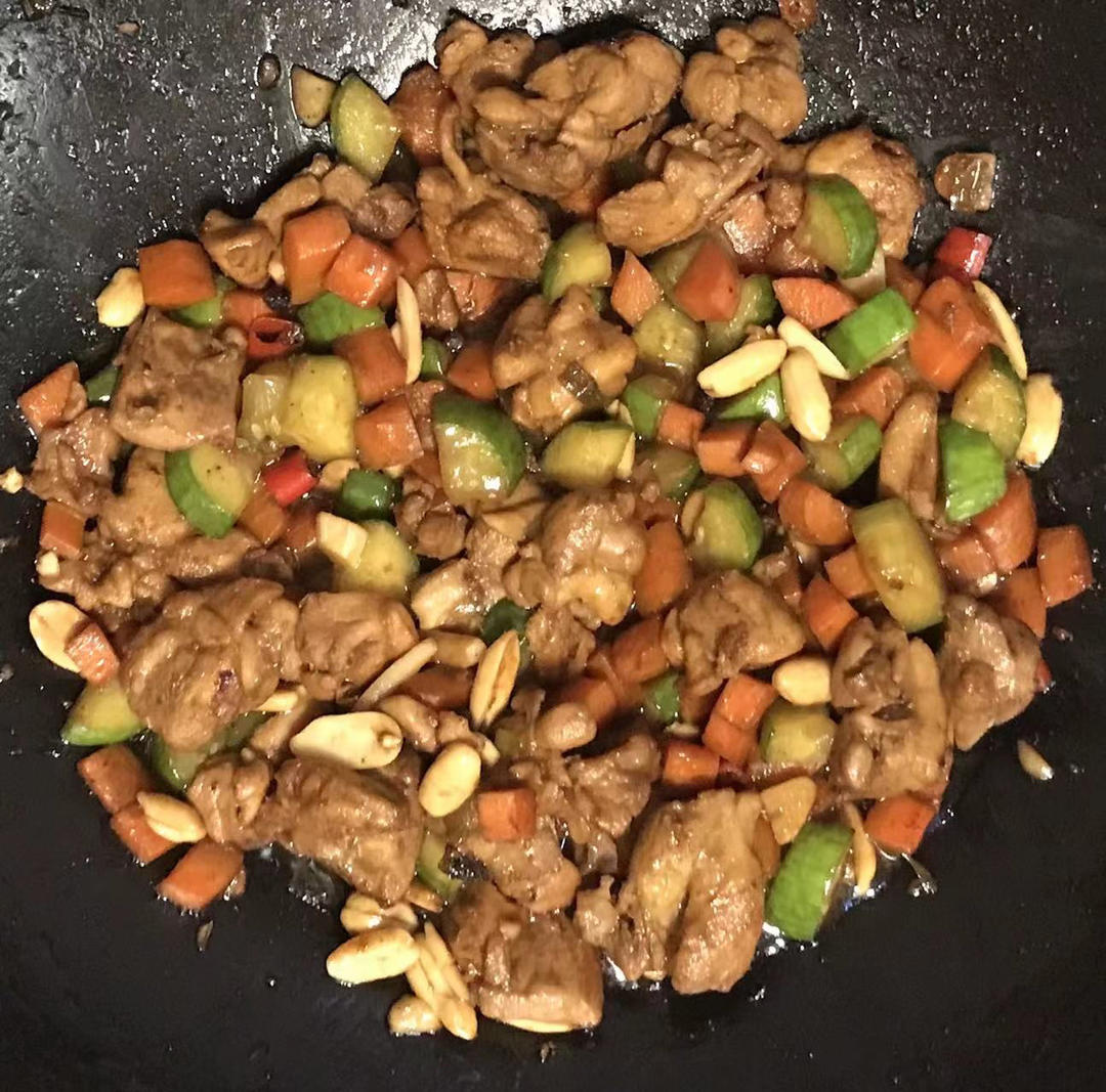 宫爆鸡丁,先腌制鸡,再热锅油炒鸡丁爆炒干水份,再放花椒,小米辣,蒜粒爆香,豆瓣酱胡萝卜炒香,……后放黄瓜#午餐•2024...