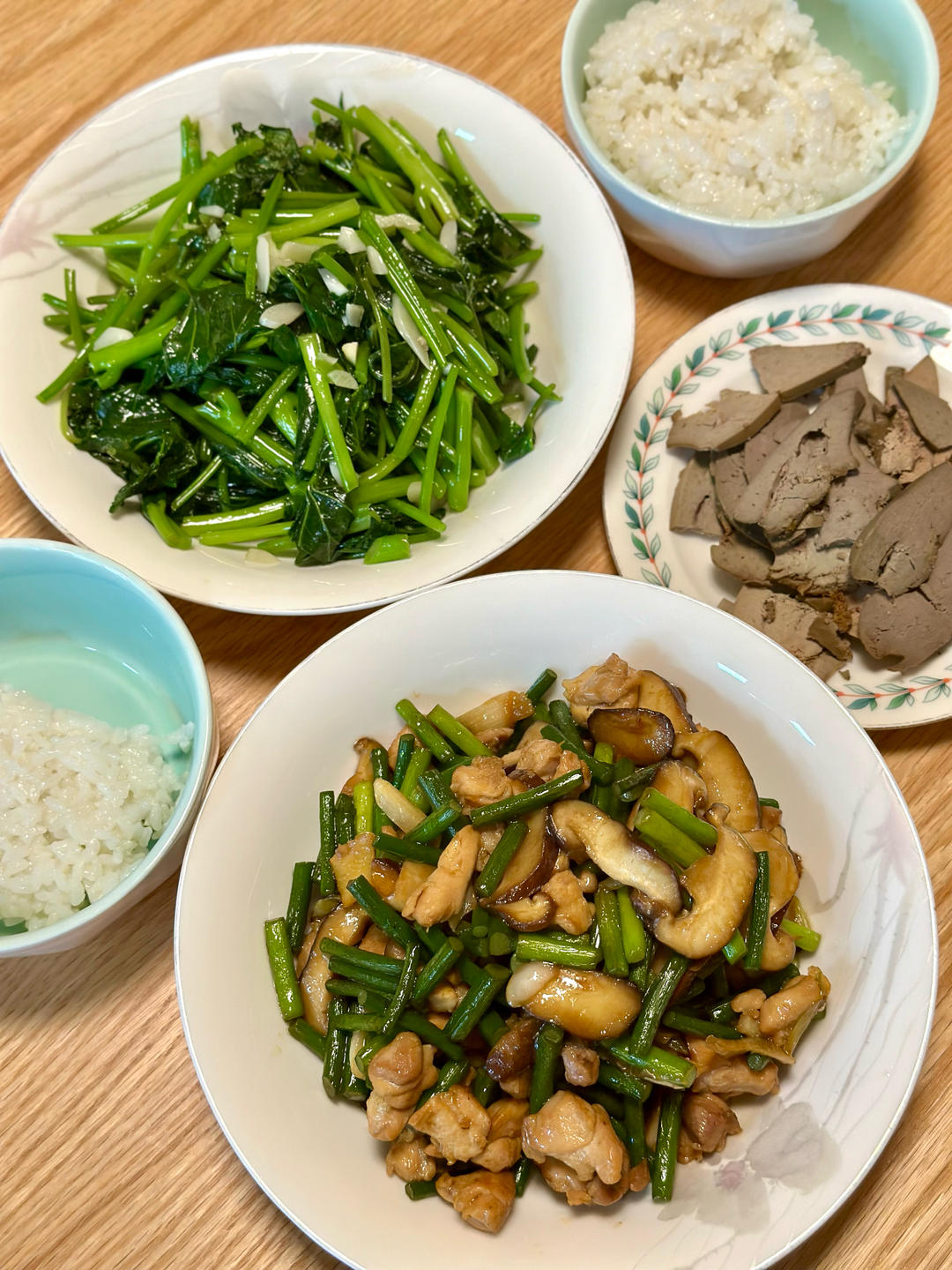 香菇鸡腿丁炒蒜苔、清炒红薯叶、卤鹅肝😋