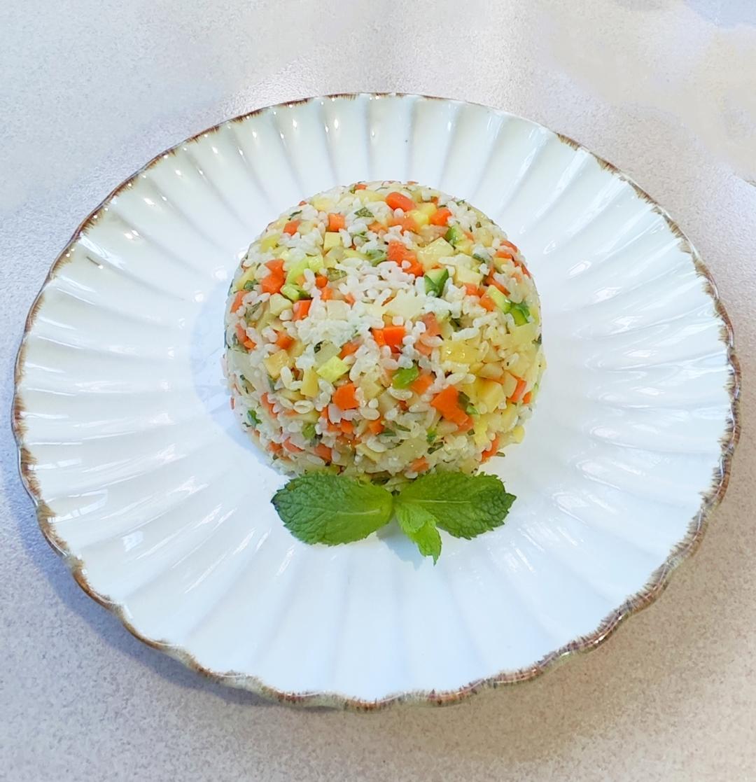 胡萝卜粒、洋芋粒、黄瓜粒、米饭,再加上昨天剩余的嫩花椒尖剁碎,炒成一盘,配上旋风煎蛋(😓)...
