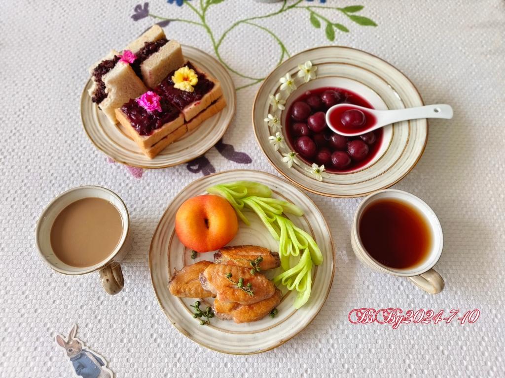 今日早餐:紫米三明治&樱桃果酱吐司,藤椒鸡翅,乌龙茶&咖啡,糖水樱...